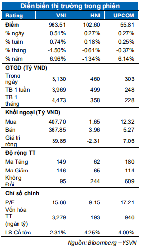 Quán tính giảm tiếp tục duy trì đầu phiên khiến VN-Index giảm về mức thấp nhất phiên tại 954.19 điểm. Tuy vậy, lực cầu giá thấp quay trở lại với đà dẫn dắt của một số bluechip giúp các chỉ số đóng cửa trên vùng giá xanh trong phiên giao dịch thứ 6 cuối cùng của 2019. VN-Index ghi nhận phiên tăng điểm với mức tăng 0.51% dừng tại 963.51 điểm. Chỉ số HNX-Index cũng đồng thuận tăng 0.27% neo tại 102.6 điểm trong khi Upcom-Index cũng có mức tăng tương tự. Điểm trừ là giá trị giao dịch khớp lệnh đạt mức thấp với hơn 2,200 tỷ đồng trên cả 3 sàn.