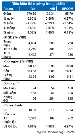 Thị trường trải qua phiên giảm điểm thứ 2 liên tiếp với chỉ số VN-Index đóng cửa giảm 0.8% dừng tại 970.39 điểm trong khi HNX-Index cũng đồng thuận giảm 0.86% chốt tại 102.34 điểm. Chỉ số Upcom-Index giảm 0.56%. Giá trị giao dịch khớp lệnh toàn thị trường đạt gần 3,700 tỷ đồng.