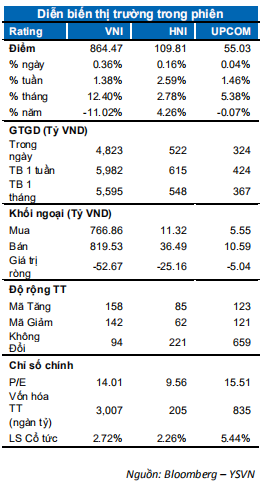 Các chỉ số đóng cửa phiên cuối tuần trong sắc xanh với mức tăng nhẹ ở tất cả chỉ số khi mặt bằng cổ phiếu khá phân hoá. Đây cũng là phiên cơ cấu Q2.20220 của quỹ iShare MSCI Frontier 100 ETF nhưng giao dịch có phần cân bằng. Chỉ số VN-Index đóng cửa tại 864.47 điểm tăng 0.36%. Chỉ số HNX-Index tăng 0.16% neo tại 109.81 điểm; chỉ số Upcom-Index tăng nhẹ. Dòng tiền tập trung chủ yếu nhóm Small-Cap và Mid-Cap nên giá trị giao dịch khớp lệnh toàn thị trường đạt hơn 4,850 tỷ đồng giảm nhẹ so với phiên liền trước.