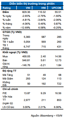 Thị trường thế giới diễn biến tiêu cực trước lo ngại làn sóng thứ 2 của dịch Covid-19. Thị trường VN cũng không ngoại lệ khi giảm khá mạnh ở tất cả chỉ số. Chỉ số VN-Index đóng cửa giảm 2.65% đóng cửa tại 829.36 điểm. Chỉ số HNX-Index giảm 2.76% neo tại 110.32 điểm; chỉ số Upcom-Index mất 1.6%. Giá trị giao dịch khớp lệnh toàn thị trường đạt 5,150 tỷ đồng tăng 39% so với phiên liền trước.