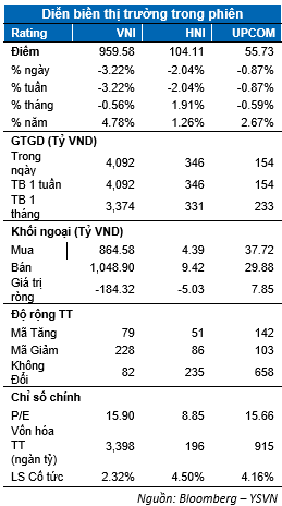Cùng chung diễn biến với thị trường khu vực, các chỉ số chứng khoán Việt Nam chìm trong sắc đỏ phiên đầu năm Canh Tý. Chỉ số VN-Index đóng cửa tại 959.58 điểm giảm 3.22%. Chỉ số HNX-Index mất 2.04% chốt tại 104.11 điểm. Giá trị giao dịch khớp lệnh tăng mạnh đạt hơn 4,350 tỷ đồng cho thấy lực bán đang áp đảo. Độ rộng thị trường nghiên về số mã giảm khi VNIndex có 274 mã giảm và 80 mã tăng.