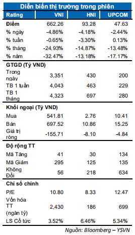 Sau 2 phiên lưỡng lự tại ngưỡng 700 điểm, chỉ số VN-Index đã suy yếu trở lại khi tâm lý thị trường vẫn thận trọng trước diễn biến dịch bệnh. Chỉ số đóng cửa giảm 4.86% dừng tại 662.26 điểm. Chỉ số HNX-Index cũng đồng thuận giảm 4.18% đóng cửa tại 93.28 điểm, Upcom-Index cũng giảm 2.44%. Điểm tích cực là giá trị giao dịch khớp lệnh tiếp tục sụt giảm khi đạt hơn 2,870 tỷ đồng toàn thị trường mặc cho biến động giảm giá mạnh trong phiên hôm nay.