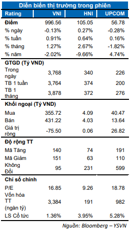 Áp lực chốt lời được đẩy mạnh khiến các chỉ số rung lắc. VN-Index chốt phiên quay đầu giảm 0.13% dừng tại 996.56 điểm mặc dù có lúc đã vượt ngưỡng 1,000 điểm. Chỉ số HNX-Index ngược lại tăng 0.27% neo tại 105.05. Chỉ số Upcom-Index giảm 0.28% chốt tại 56.78 điểm. Dòng tiền duy trì ở mức cao với giá trị giao dịch khớp lệnh đạt 3,800 tỷ đồng trên cả ba sàn.