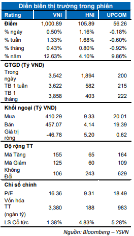 Chỉ số VN-Index ghi nhận phiên giao dịch tích cực khi đóng cửa tăng 0.5% dừng tại 1000,89 điểm.  Chỉ số HNX-Index cùng chiều tăng mạnh 1.15% dừng 105.89 điểm. Chỉ số Upcom-Index đóng cửa giảm nhẹ. Giá trị khớp lệnh cải thiện khi đạt 3,600 tỷ đồng trên toàn thị trường.