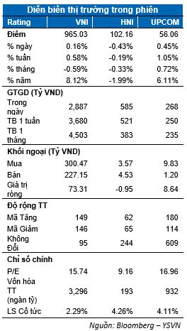 VN-Index có phiên tăng điểm nhưng biên độ tăng không đáng kể. Cụ thể, chỉ số đóng cửa tăng 0.16% dừng tại 965.03 điểm. Chỉ số HNX-Index ngược lại giảm 0.43% neo tại 102.16 điểm trong khi Upcom-Index tăng 0.45% chốt tại 56.06 điểm. Giá trị giao dịch đạt hơn 2,750 tỷ đồng khớp lệnh trên cả 3 sàn.