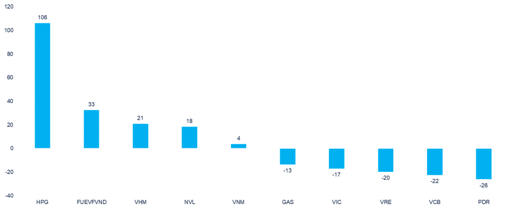 - Khối ngoại giao dịch khá cân bằng, lượng bán ròng vẫn chủ yếu tập trung nhóm Ngân hàng (30 tỷ), Bất động sản (28 tỷ).