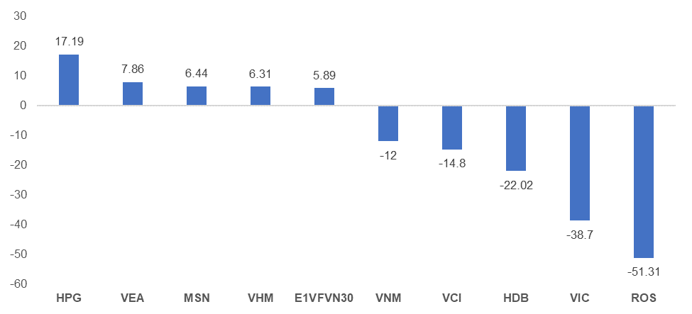 Khối ngoại bán ròng mạnh gần 126 tỷ và phần lớn chủ yếu tập trung bán ròng ở cổ phiếu ROS và VIC.