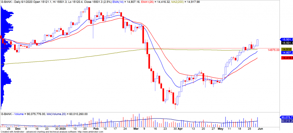 - Đồ thị giá của chỉ số ngành Ngân hàng vượt mức kháng cự ngắn hạn kèm khối lượng giao dịch tăng mạnh, nhưng mức biến động tương quan của chỉ số này vẫn còn thấp so với tuần giao dịch trước cho nên rủi ro ngắn hạn có thể gia tăng nếu chỉ số này điều chỉnh ở phiên kế tiếp.