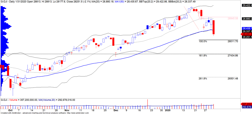 TTCK vẫn tiếp tục ảnh hưởng tiêu cực từ đại dịch virus Corona. Chỉ số Dow Jones đóng cửa giảm mạnh hơn 2% và đồ thị giá giảm dưới đường trung bình 50 ngày. Đồng thời, đồ thị giá có dấu hiệu bước vào giai đoạn biến động mạnh theo chiều hướng tiêu cực cho thấy xu hướng giảm có thể hướng về các mức thấp hơn với các mức hỗ trợ lần lượt là 28,011 điểm và 27,435 điểm. Ở kịch bản xấu nhất, chỉ số Dow Jones có thể sẽ mất hơn 6%, tức là rơi về vùng giá 26,500 điểm.