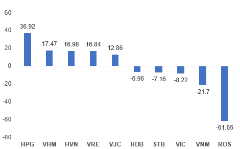 Khối ngoại quay trở lại bán ròng gần 19 tỷ trên cả ba sàn. Trong đó, tập trung gom mạnh cổ phiếu HPG và đã giúp cho cổ phiếu này có đà tăng mạnh trong phiên, nhưng sau đó HPG không thể vượt được ngưỡng kháng cự ngắn hạn 23.10.