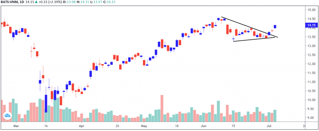 - Giá Van Eck tăng mạnh gần 2.4% và đồ thị giá có dấu hiệu thoát khỏi giai đoạn tích lũy.