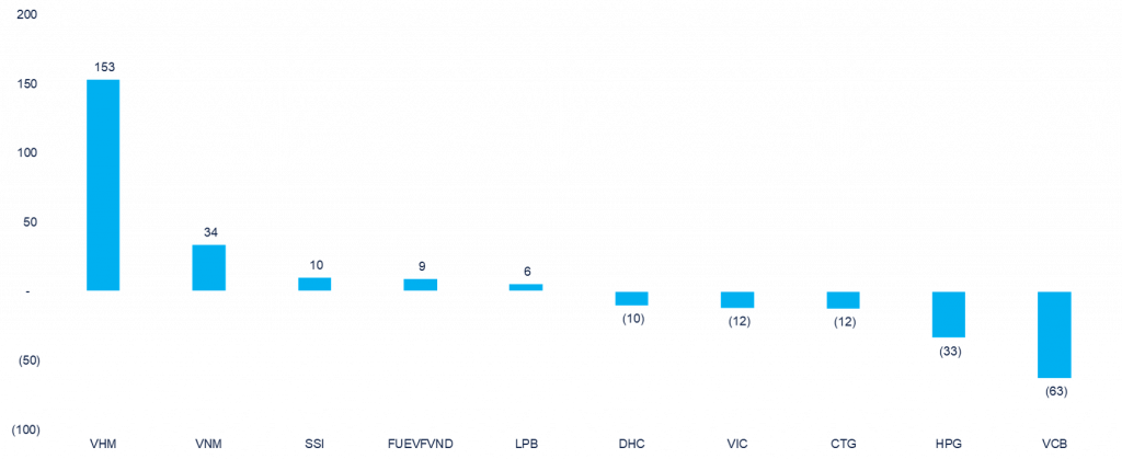 - VHM tiếp tục là cổ phiếu được khối ngoại mua ròng mạnh và giá cổ phiếu VHM cũng tăng mạnh 4% với khối lượng giao dịch tăng đột biến so với mức khối lượng trung bình 20 phiên.
