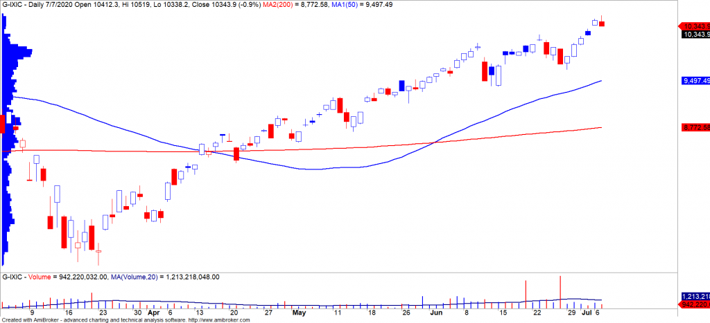 - Chỉ số Nasdaq kết thúc chuỗi tăng 5 phiên liên tiếp. Tuy nhiên, xu hướng ngắn hạn vẫn duy trì ở mức TĂNG cho nên chúng tôi đánh giá đây chỉ là các nhịp điều chỉnh ngắn hạn.