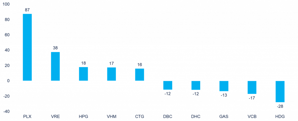 - Khối ngoại tập trung mua ròng mạnh ở PLX và VRE. Ngoài ra, nổi bật nhất là cổ phiếu HPG khi khối ngoại nhanh chóng chuyển hướng mua ròng vào cuối phiên và cổ phiếu này cũng biến động mạnh tại vùng đỉnh cũ.