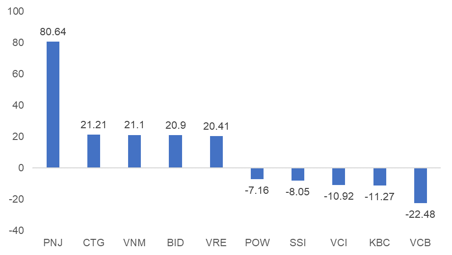 Khối ngoại mua ròng mạnh gần 139 tỷ trong phiên tăng mạnh. Đồng thời, chúng tôi quan sát giá trị mua/bán đều gia tăng cả hai chiều cho thấy khối ngoại cũng đang dần giao dịch tích cực trở lại.