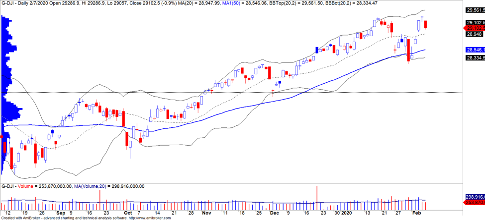 Phố Wall điều chỉnh mạnh ở nhiều chỉ số do lo ngại về tốc độ nhiễm bệnh và tử vong của virus Corona. Chỉ số Dow Jones đóng cửa -0.9% và đồ thị giá có dấu hiệu bước vào giai đoạn tích lũy cho nên đồ thị giá có thể sẽ biến động hẹp trong những phiên giao dịch tới. Đồng thời, xu hướng ngắn hạn vẫn duy trì ở mức TĂNG.