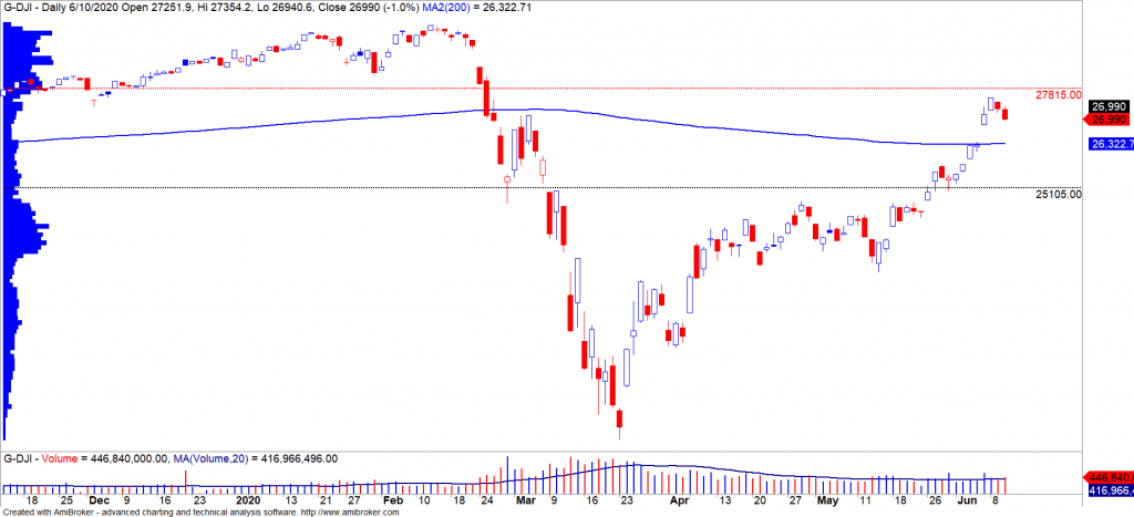 - TTCK Mỹ tiếp tục có diễn biến trái chiều, sắc xanh duy trì duy nhất ở chỉ số Nasdaq. Còn chỉ số Dow Jones đóng của giảm hơn 1% với khối lượng gia tăng so với phiên 09/06/2020, nhưng nhịp điều chỉnh vẫn chưa ảnh hưởng lên xu hướng tăng ngắn hạn.