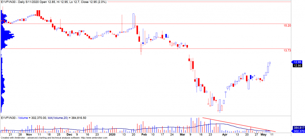 - CCQ E1VFVN30 tiếp tục được mua ròng nhẹ và vẫn giao dịch ở mức giá trị thanh khoản thấp. Xu hướng ngắn hạn của CCQ E1VFVN30 vẫn duy trì ở mức TĂNG với hai mức kháng cự quan trọng là 13.73 và 15.20 cho nên chúng tôi kỳ vọng CCQ này sẽ sớm được huy động trở lại trong ngắn hạn.