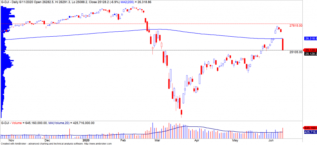- Chỉ số Dow Jones đóng cửa giảm gần 7% và đồ thị giá giảm dưới đường trung bình 200 ngày. Đồng thời, xu hướng ngắn hạn bị hạ từ mức TĂNG xuống GIẢM, điểm tích cực là đồ thị giá đã giảm về mức hỗ trợ ngắn hạn 25,105 điểm cho nên đồ thị giá có thể sẽ xuất hiện nhịp hồi phục kỹ thuật trong vài phiên tới.
