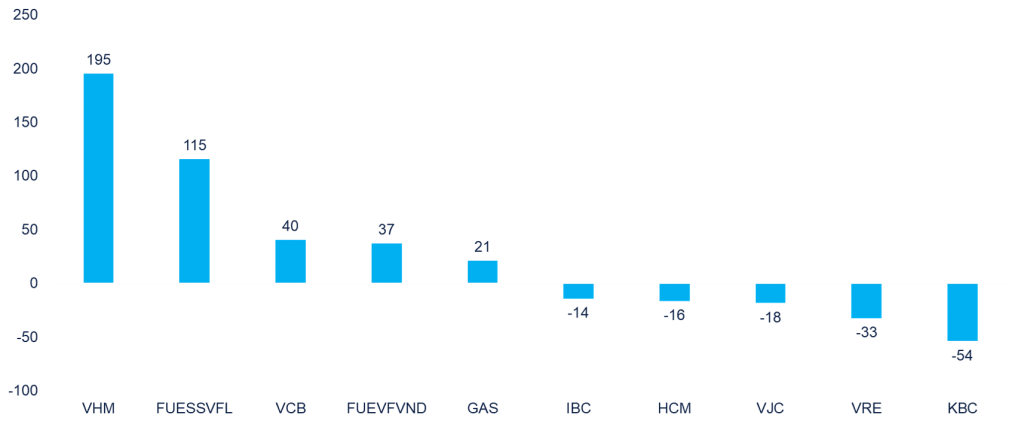- Khối ngoại tập trung mua ròng mạnh ở cổ phiếu VHM và hai chứng chỉ quỹ ETF mới niêm yết cho thấy khối ngoại vẫn tỏ ra lạc quan với thị trường bất chấp đà bán tháo của các NĐT trong nước.