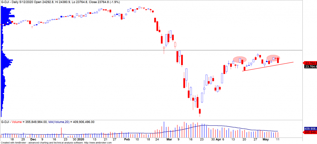 Phố Wall điều chỉnh mạnh ở hầu hết các chỉ số chính khi giới đầu tư lo ngại về tình hình dịch leo thang trở lại sau khi tiến hành nới lỏng cách ly xã hội. Chỉ số Dow Jones đóng cửa giảm 1.9% và đồ thị giá của chỉ số này đang gặp khó khăn trước ngưỡng kháng cự 25,140 điểm, nhưng xu hướng ngắn hạn vẫn duy trì ở mức TĂNG.