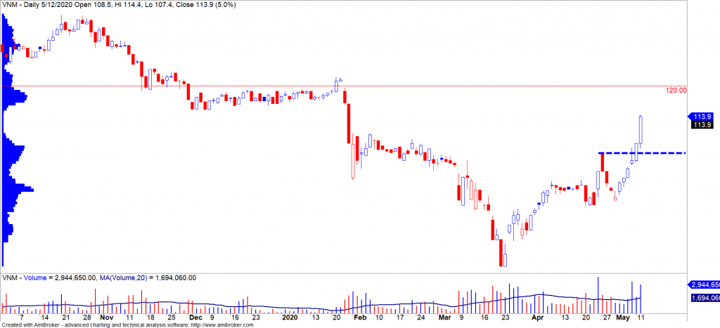 - Đồ thị giá của VNM đã tiến về gần mức kháng cự ngắn hạn 120 cho nên chúng tôi đánh giá áp lực điều chỉnh có thể gia tăng ở mức kháng cự này và các nhà đầu tư cần hạn chế mua mới ở mức giá hiện tại, chờ mua vào ở nhịp điều chỉnh.