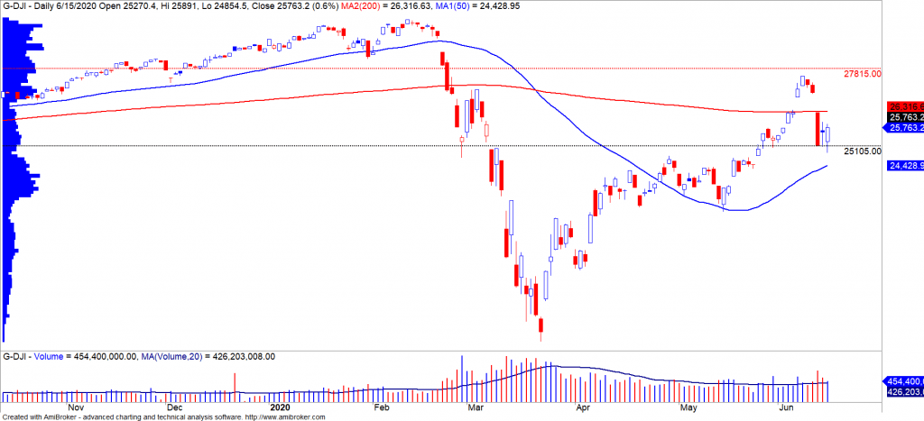 - Chỉ số Dow Jones đóng cửa tăng 0.6% và vẫn giao dịch dưới đường trung bình 200 ngày. Đồng thời, xu hướng ngắn hạn vẫn duy trì ở mức GIẢM.