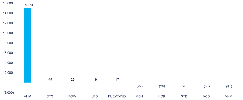 - Giá trị mua ròng đột biến này chủ yếu tập trung ở cổ phiếu VHM với giá trị hơn hơn 15,000 tỷ, nếu loại trừ lượng mua ròng đột biến này thì khối ngoại vẫn đang bán ròng gần 127 tỷ trên cả ba sàn.