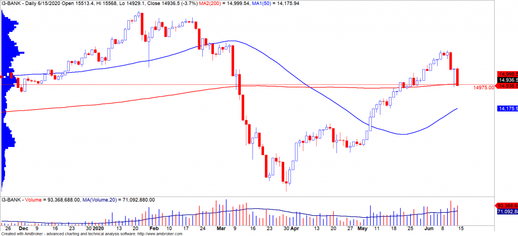 - Đồ thị giá của chỉ số nhóm Ngân hàng giảm mạnh gần 4% trong phiên 15/06/2020, nhưng mức sức mạnh giá vẫn duy trì trên 80. Điểm tích cực là đồ thị giá đang giao dịch quanh các ngưỡng hỗ trợ ngắn hạn của đường trung bình 200 ngày. Do đó, chúng tôi cho rằng nhịp hồi phục có thể sẽ hình thành trong vài phiên tới.