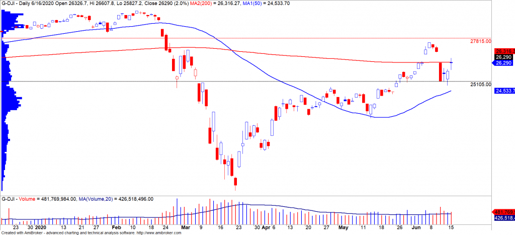 - Chỉ số Dow Jones tăng về sát đường trung bình 200 ngày. Tuy nhiên, xu hướng ngắn hạn vẫn duy trì ở mức GIẢM cho nên chúng tôi đánh giá đây vẫn chỉ là nhịp hồi phục ngắn hạn và có thể sẽ nhanh chóng kết thúc.