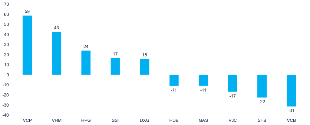 - Ở chiều bán ròng, nhóm Ngân hàng bị bán ròng nhẹ và tập trung chủ yếu ở VCB và STB.