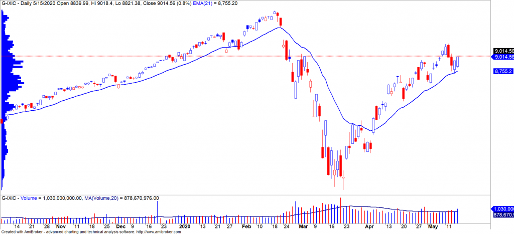 Phố Wall duy trì đà tăng khi Hạ viện thông qua gói cứu trợ 3,000 tỷ USD. Chỉ số Dow Jones quay trở lại đường trung bình EMA(21) và duy trì xu hướng TĂNG ngắn hạn, trong khi đó chỉ số Nasdaq vẫn duy trì ở mức hỗ trợ của đường trung bình EMA(21) với mức thanh khoản cải thiện rõ rệt. Điểm tích cực là rủi ro ngắn hạn vẫn ở mức thấp.