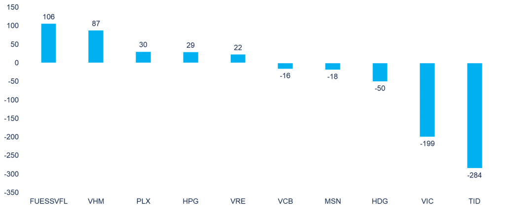 • Lượng bán ròng phần lớn chủ yếu tập trung từ giao dịch thỏa thuận của TID với giá trị hơn 284 tỷ. Nếu loại trừ lượng giao dịch đột biến này thì khối ngoại bán ròng nhẹ chỉ còn hơn 15 tỷ trên cả ba sàn.