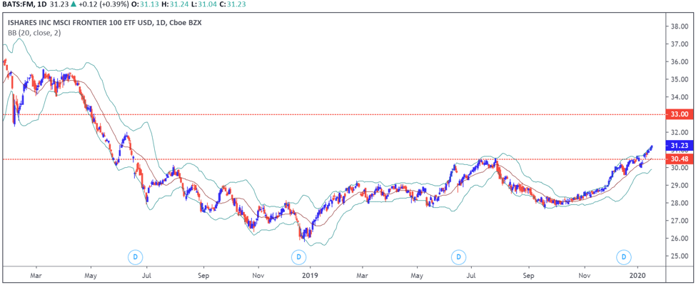Giá CCQ iShares MSCI Frontier 100 ETF (FM) vượt hoàn toàn khỏi mức kháng cự 30.5. Đồng thời, xu hướng tăng ngắn hạn có thể sẽ tiếp tục mở rộng về mức 33.0 cho nên tỷ lệ Premium của quỹ này có thể sẽ duy trì ở trạng thái tích cực và dự báo sẽ tiếp tục huy động thêm CCQ trong ngắn hạn.