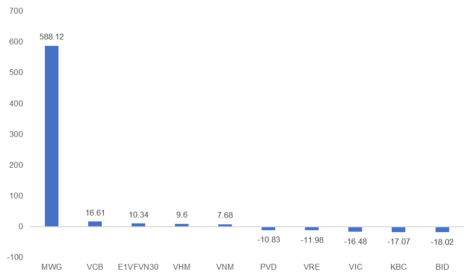 Khối ngoại mua ròng đột biến gần 532 tỷ. Trong đó, khối ngoại chủ yếu giao dịch thỏa thuận ở cổ phiếu MWG với giá trị mua ròng lên đến 588 tỷ.