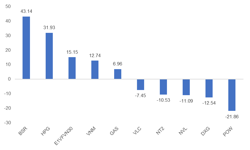 Khối ngoại tiếp tục mua ròng 55.7 tỷ và phần lớn tập trung ở cổ phiếu BSR sau khi doanh nghiệp này công bố KQKD quý 4/2019 với mức lãi 1,507 tỷ đồng, cải thiện mạnh so với mức lỗ 959 tỷ cùng kỳ, nguyên nhân chính là giá dầu thô thế giới tăng mạnh trong thời gian qua. Trong khi đó, trên sàn HSX, HPG và CCQ E1VFVN30 tiếp tục được khối ngoại mua ròng cho thấy khối ngoại vẫn đang tỏ ra lạc quan với xu hướng hiện tại của thị trường.