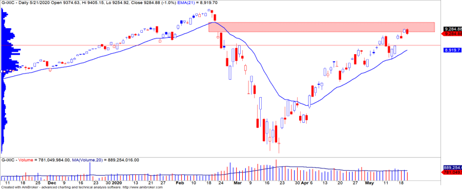 - Chỉ số Nasdaq đóng cửa giảm 1% và đồ thị giá giao dịch dưới vùng kháng cự của khoảng trống giảm giá (thể hiện như trên biểu đồ).