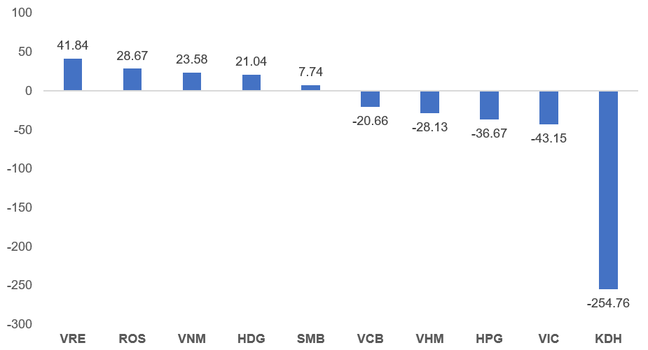 Khối ngoại bán ròng mạnh với giá trị hơn 344 tỷ và chủ yếu tập trung bán ròng ở nhóm VN30. Tuy nhiên, trong đó có lượng giao dịch thỏa thuận của KDH với hơn 10 triệu cổ phiếu bị bán ra của khối ngoại, đây có thể là lượng đăng ký bán ra của quỹ Vinacap. Đồng thời, tự doanh cũng gia tăng bán ròng hơn 800 tỷ và phần lớn cũng chủ yếu tập trung bán ròng ở nhóm cổ phiếu VN30.