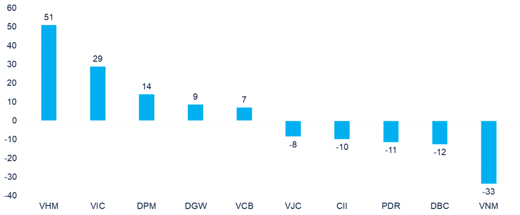 • Ở chiều bán ròng, khối ngoại tập trung bán ròng nhóm Sản xuất thực phẩm (35.3 tỷ).