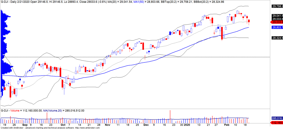 Phố Wall đóng cửa chìm trong sắc đỏ khi nổi lo về virus Corona lan rộng ra các quốc gia châu Á. Đồng thời, dịch bệnh cũng kéo theo sự tăng trưởng toàn cầu suy yếu. Giá vàng tăng mạnh và mức chênh lệch lợi suất cổ tức 10 năm và 2 năm tiếp tục giảm cho thấy rủi ro lo ngại khủng hoảng gia tăng.