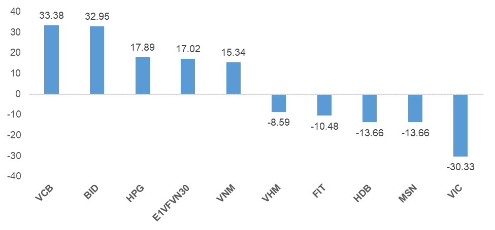 Khối ngoại mua ròng nhẹ hơn 38 tỷ trên cả ba sàn. Đồng thời, khối ngoại chủ yếu tập trung mua ròng ở nhóm cổ phiếu ngân hàng, nhiều nhất là VCB và BID.