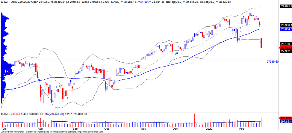 - Chỉ số Dow Jones đóng cửa giảm 3.6% và đồ thị giá có dấu hiệu bước vào giai đoạn biến động mạnh theo chiều hướng tiêu cực. Đồng thời, xu hướng ngắn hạn cũng bị hạ từ mức TĂNG xuống GIẢM và mức hỗ trợ gần nhất là 27,400 điểm.