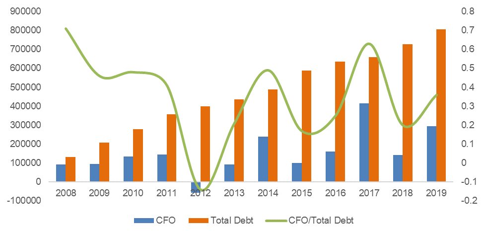 Đồ thị trên cũng cho thấy nợ vay của các doanh nghiệp gia tăng một cách đều đặn trong khi CFO mặc dù có xu hướng tăng trong giai đoạn từ 2013 tới 2019 nhưng lại có sự trồi sụt mạnh giữa các năm. Điểm tích cực đó là tỷ lệ CFO/tổng nợ vay cũng có xu hướng tăng, hàm ý trong giai đoạn tăng trưởng của nền kinh tế vừa qua CFO vẫn có tốc độ tăng nhanh hơn so với nợ vay, điều này đảm bảo tính thanh khoản của doanh nghiệp trong ngắn hạn khi tình hình hoạt động sản xuất kinh doanh đang chịu ảnh hưởng tiêu cực từ dịch bệnh Covid-19.