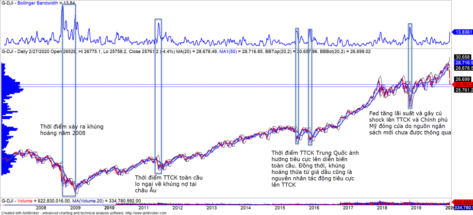 - Theo thống kê lịch sử, chỉ số BBW (Bollinger Bands Width) tăng mạnh về gần các mức đỉnh lịch sử đã từng xảy ra trong quá khứ và gần nhất là mức đỉnh trong các năm 2015, 2016 và 2018. Thông thường, thị trường có thể sớm chững lại đà giảm và bước vào giai đoạn tích lũy sau đó hoặc hình thành đáy chữ V (đáy nhọn).