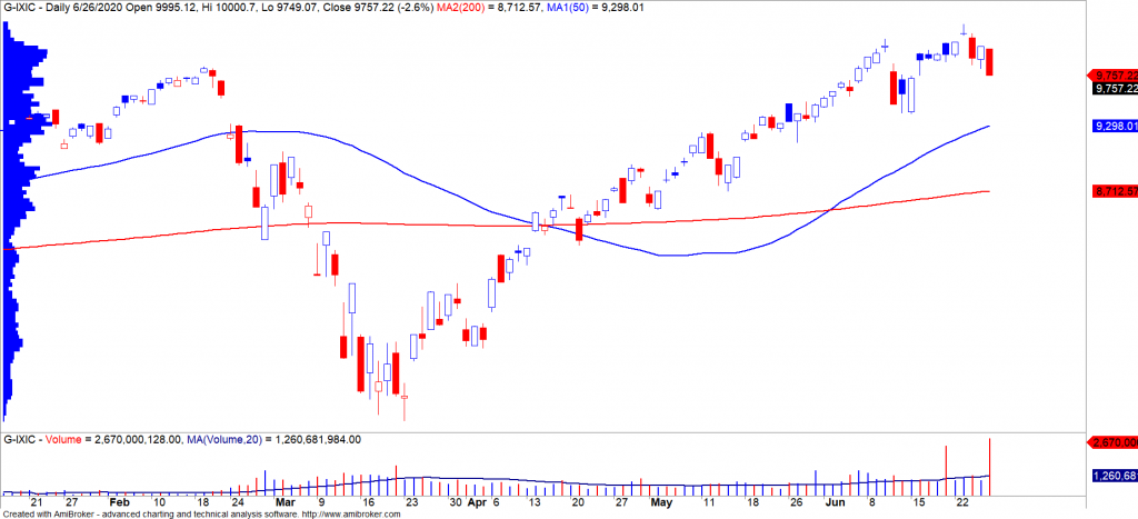 • Chỉ số Nasdaq đóng cửa -2.6% với khối lượng giao dịch tăng mạnh. Đồng thời, xu hướng ngắn hạn bị hạ từ mức TĂNG xuống GIẢM. Mức hỗ trợ gần nhất của chỉ số này là đường trung bình 50 ngày (tức là mức 9,400 điểm).