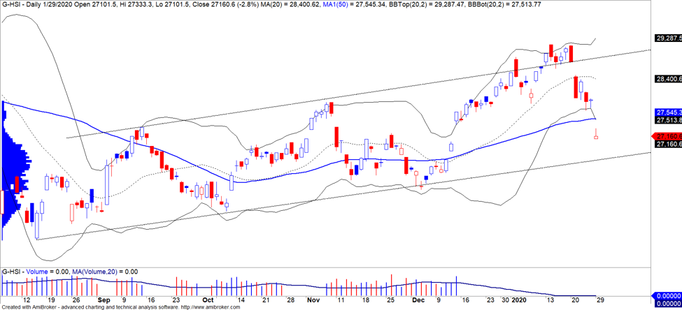 Dịch bệnh tại Trung Quốc đã tác động tiêu cực lên TTCK toàn cầu. Các chỉ số chứng khoán châu Á như Shanghai, Hang Seng đều bước vào giai đoạn giảm ngắn hạn. Chỉ số Hang Seng mở cửa giảm mạnh gần 3% sau khi mở cửa giao dịch vào đầu năm Canh Tý và chỉ số này vẫn đang trong xu hướng GIẢM ngắn hạn.