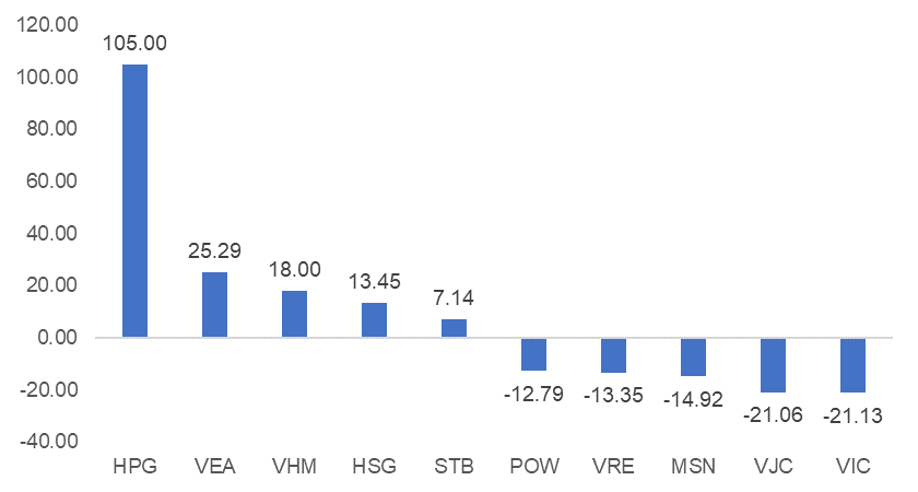 Khối ngoại tiếp tục tỏ ra lạc quan và mua ròng hơn 100 tỷ. Trong đó, khối ngoại chủ yếu tập trung mua ròng mạnh ở cổ phiếu HPG với giá trị hơn 105 tỷ và đồ thị giá của cổ phiếu này cũng hướng về mức kháng cự 26.50.