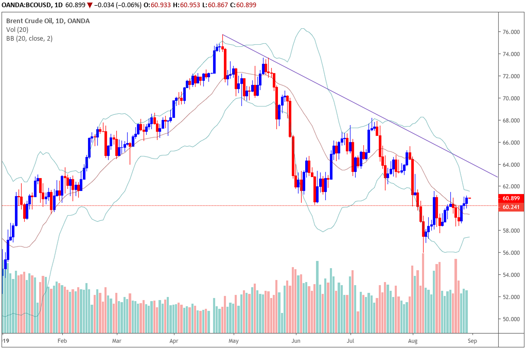 Giá dầu Brent tiếp tục phục hồi trong bối cảnh lạc quan về đàm phán thương mại Mỹ-Trung. Đồ thị giá của Brent tiến sát mức kháng cự ngắn hạn và vẫn đang trong giai đoạn tích lũy, nhiều khả năng đồ thị giá sẽ tiếp tục thử thách mức kháng $61.5 và nếu vượt được mức này thì xu hướng ngắn hạn có thể sẽ có chuyển biến tích cực hơn.