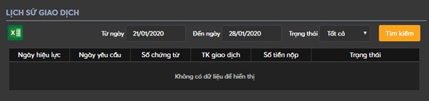 Mô tả: Màn hình “Lịch sử giao dịch” cho phép khách hàng tra cứu lịch sử nộp tiền mà khách hàng đã thực hiện.