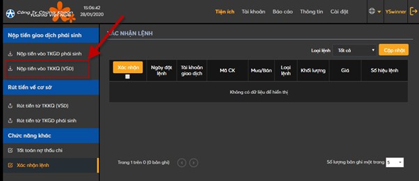 Hiển thị màn hình nộp tiền vào tài khoản ký quỹ: